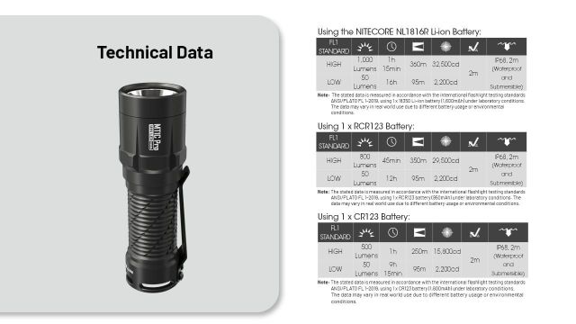 Seguendo il principio "Less is TAC", combina prestazioni eccezionali, peso e dimensioni ridotti, semplicità d'uso e durata superiore. Dotata del LED UHi 20, offre fino a 1.000 lumen ed una distanza di illuminazione di 360 metri. Pesa solo 80g (batteria inclusa) ed è facilmente trasportabile. Include una batteria ricaricabile NL1816R da 1.600mAh, con il 45% di capacità in più rispetto alle batterie 18350 standard, garantendo fino a 16 ore di uso continuo. Ha una porta di ricarica USB-C ed è compatibile con batterie CR123/RCR123. La MT1C Pro è pensata per essere utilizzata facilmente ad una sola mano tramite un unico pulsante di accensione e selezione luminisa, con funzione tattica momentanea. Realizzata in lega di alluminio aeronautico con finitura anodizzata militare HA III, è resistente a graffi, usura e impatti, con una struttura sigillata che la rende più affidabile e durevole oltre ad essere resistente all'acqua come da standard IP68. Caratteristiche Chiave:* Utilizza un LED