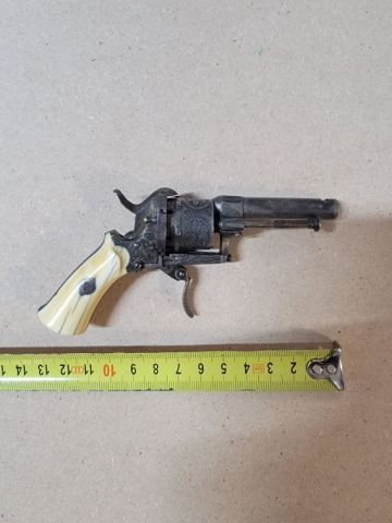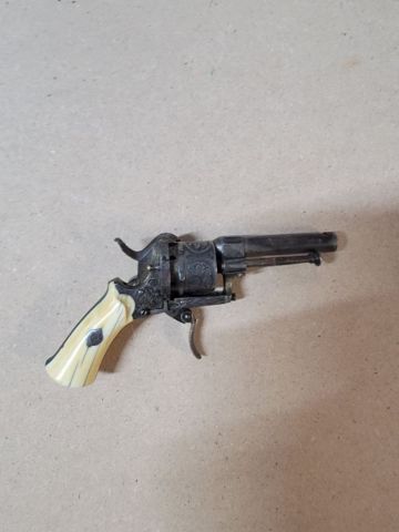 Antico revolver del 1860 circa, 6 colpi, grilletto pieghevole, piastre in avorio, produttore Lefaucheux probabilmente,. Sulla denuncia è riportato calibro 6.35 ma non ne sono sicuro.