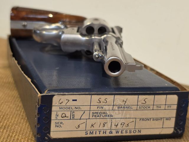REVOLVER CAL.38 SPL, 1974, CANNA SPINATA 4 INCHES CON MIRE REGOLABILI, PRIMA SERIE CON TACCA E MIRINO INOX, PARI AL NUOVO NELLA SUA SCATOLA ORIGINALE CON DOCUMENTI ED ACCESSORI. NON SPORTIVO.