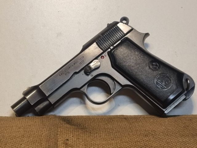 PISTOLA CAL. 9 CORTO DEL 1977 IN DOTAZIONE ALLA GdF. DOTATA DI CANNA PIU' LUNGA DI 12 MM , SCATTO MIGLIORATO E CARICATORE CON FONDELLO DRITTO. 8 RD. PRIMA VERSIONE CON GUANCETTE CON BORDO METALLICO E ANELLO PER IL CORREGGIOLO. MONOMATRICOLA, IN OTTIME CONDIZIONI. CANNA OTTIMA. CARICATORE SCORTA CON POGGIADITO