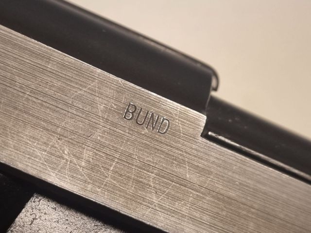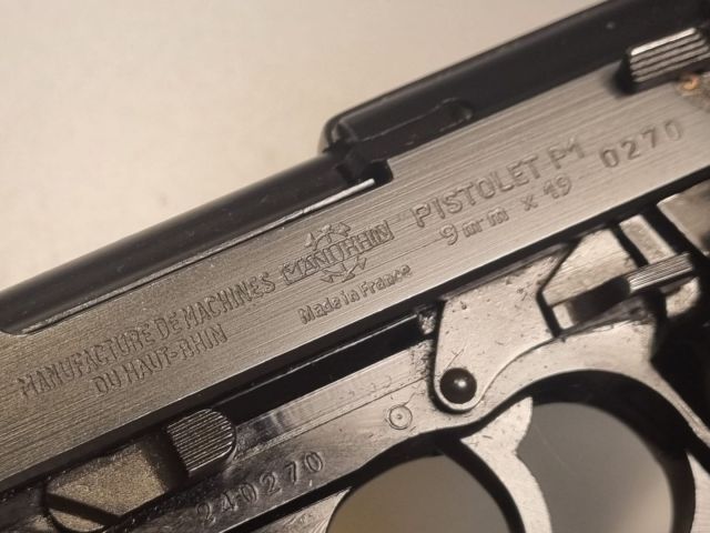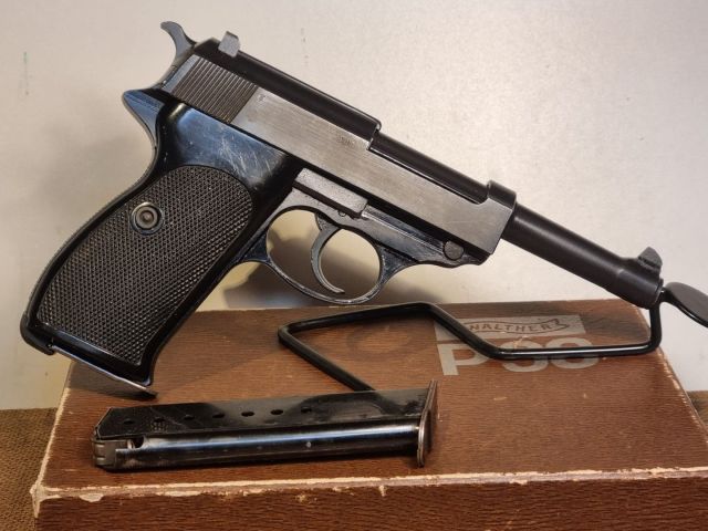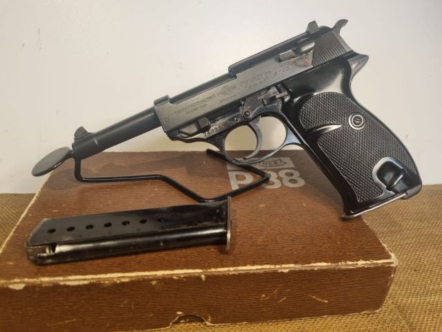 PISTOLA CAL. 9X19 PRODOTTA IN FRANCIA SU LICENZA WALTHER NEL PERIODO TRA IL 1946 E IL 1960 NEL QUALE LA WALTHER NON POTEVA PRODURRE ARMI CORTE. RIPORTA MARCHI MILITARI E LA SCRUTTA BUND. MONOMATRICOLA E SEMINUOVA CON CANNA PERFETTA, IN SCATOLA WALTHER P38 CON CARICATORE RISERVA. IN CORSO CLASSIFICAZIONE SPORTIVA.