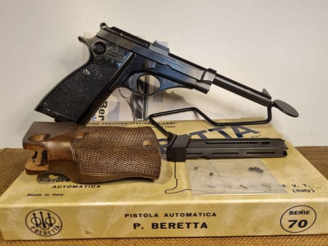 PISTOLA SPORTIVA CAL. 22LR, 1968, CANNA MM. 150 E MIRE REGOLABILI MONTATE SULLA CANNA, SEMINUOVA CON MINIMI SEGNI D'USO NELLA SUA SCATOLA D'EPOCA CON DOCUMENTI, RICAMBI E CARICATORE SCORTA. IN DOTAZIONE ANCHE GUANCETTE ORIGINALI IN LEGNO.