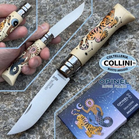 Dalkhafine è un'artista francese poliedrico che opera in diverse discipline: illustrazione, motion design, serigrafia, pittura, abbigliamento, e tanto altro; il suo mondo è colorato e ampiamente ispirato dalla natura. Il N. 08 Cosmos Dalkhafine mette in scena l'incontro tra il potere terrestre e l'energia cosmica: la tigre, forte e maestosa, si inchina davanti alla sirena la cui testa brilla come un sole. Il sole rappresenta la stella sovrana che veglia sull'universo, proprio come la sirena veglia sulla luna. Il coltellino tascabile ha un manico in carpino PEFC con decorazione a sublimazione e una lama di 8,5 cm in acciaio inossidabile. È corredato di un scatola, che riprende i motivi del coltello, e di una cartolina. Edizione limitata a 8200 esemplari, lame numerate. Destinazione d'uso: CollezioneTipo di produzione: IndustrialePaese di produzione: FranciaLama: in acciaio inox 12C27Finitura lama: satinaturaManicatura: in legno di carpino, con decorazione a sublimazione 3DLunghez